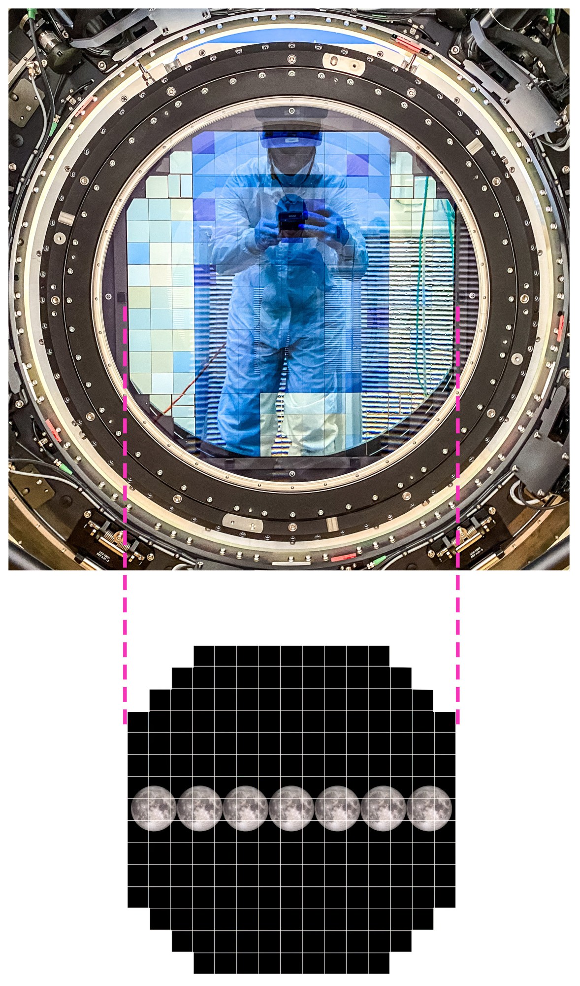 To accomplish its work, Rubin relies on an innovative three-mirror design unlike that of any other telescope. Its primary mirror is actually made up of two separate surfaces with different curvatures. The outer section, 8.4 meters wide, captures light from the universe and reflects it onto a 3.4-meter-wide secondary mirror located above it. This bounces the light back onto the inner part of the primary, which stretches five meters across and is considered a tertiary mirror, before being reflected into a digital camera. The compact configuration allows the enormous instrument to be powerful but nimble as it shifts around to take roughly 1,000 photos per night.