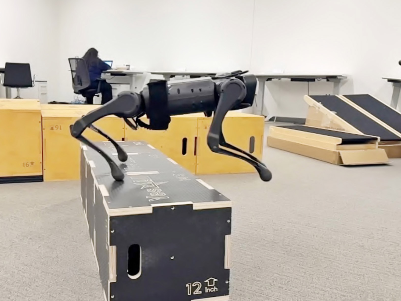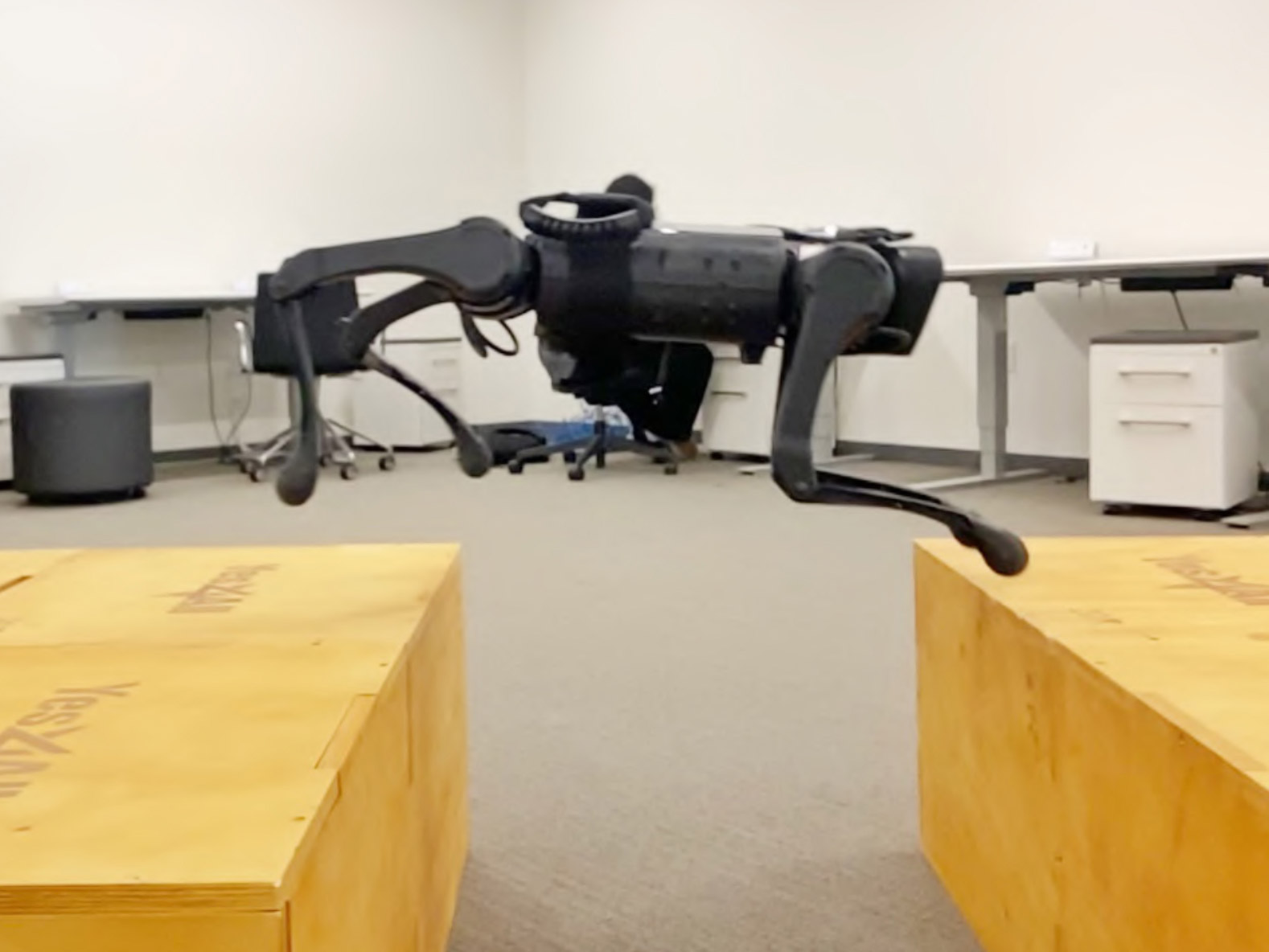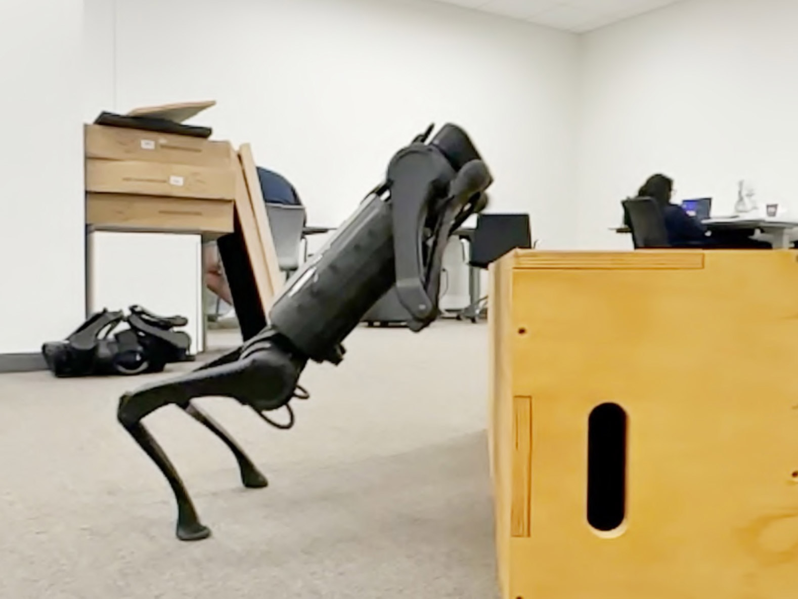 Pathak’s robot dogs have since leveled up. The team’s latest algorithm allows a quadruped robot to do extreme parkour. The robot was again trained to move around in a general way in a simulation. But using reinforcement learning, it was then able to teach itself new skills on the go, such as how to jump long distances, walk on its front legs, and clamber up tall boxes twice its height. These behaviors were not something the researchers programmed. Instead, the robot learned through trial and error and visual input from its front camera. “I didn’t believe it was possible three years ago,” Pathak says.