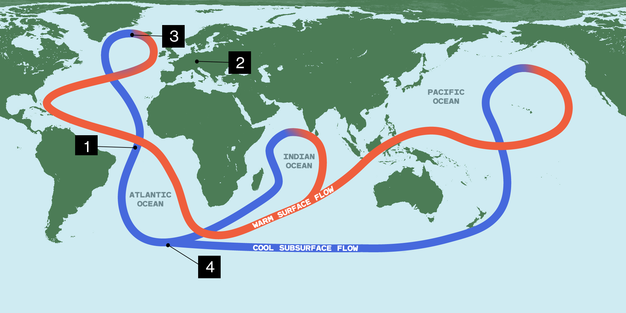 The Atlantic circulation is, effectively, one leg of the world’s mightiest river. It runs tens of thousands of miles from the Southern Ocean to Greenland and back, ping-ponging between the southwestern coast of Africa, the southeastern US, and Western Europe.